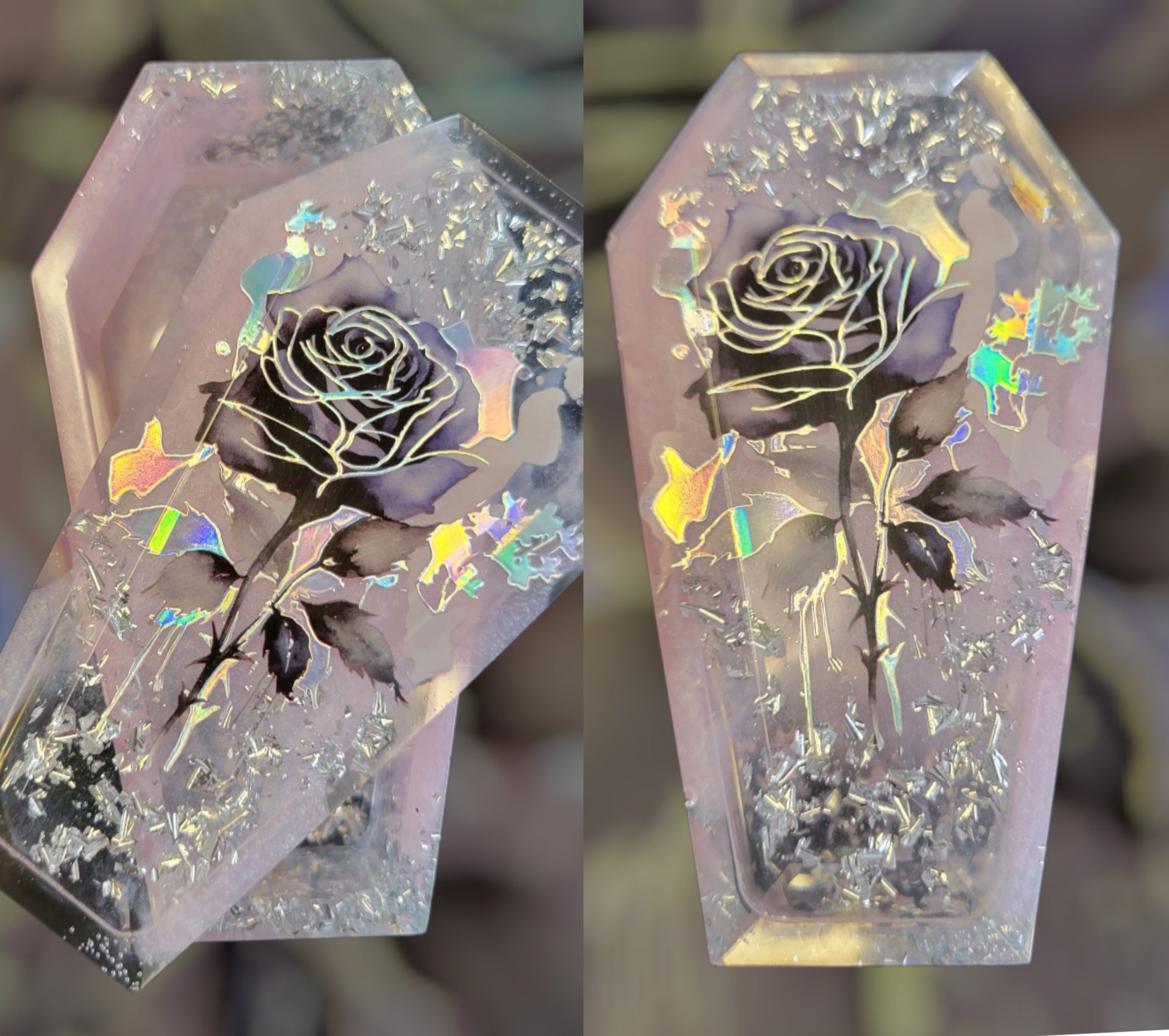 1/pc. Rose et feuilles métalliques argentés. Orné d'une rose noir.