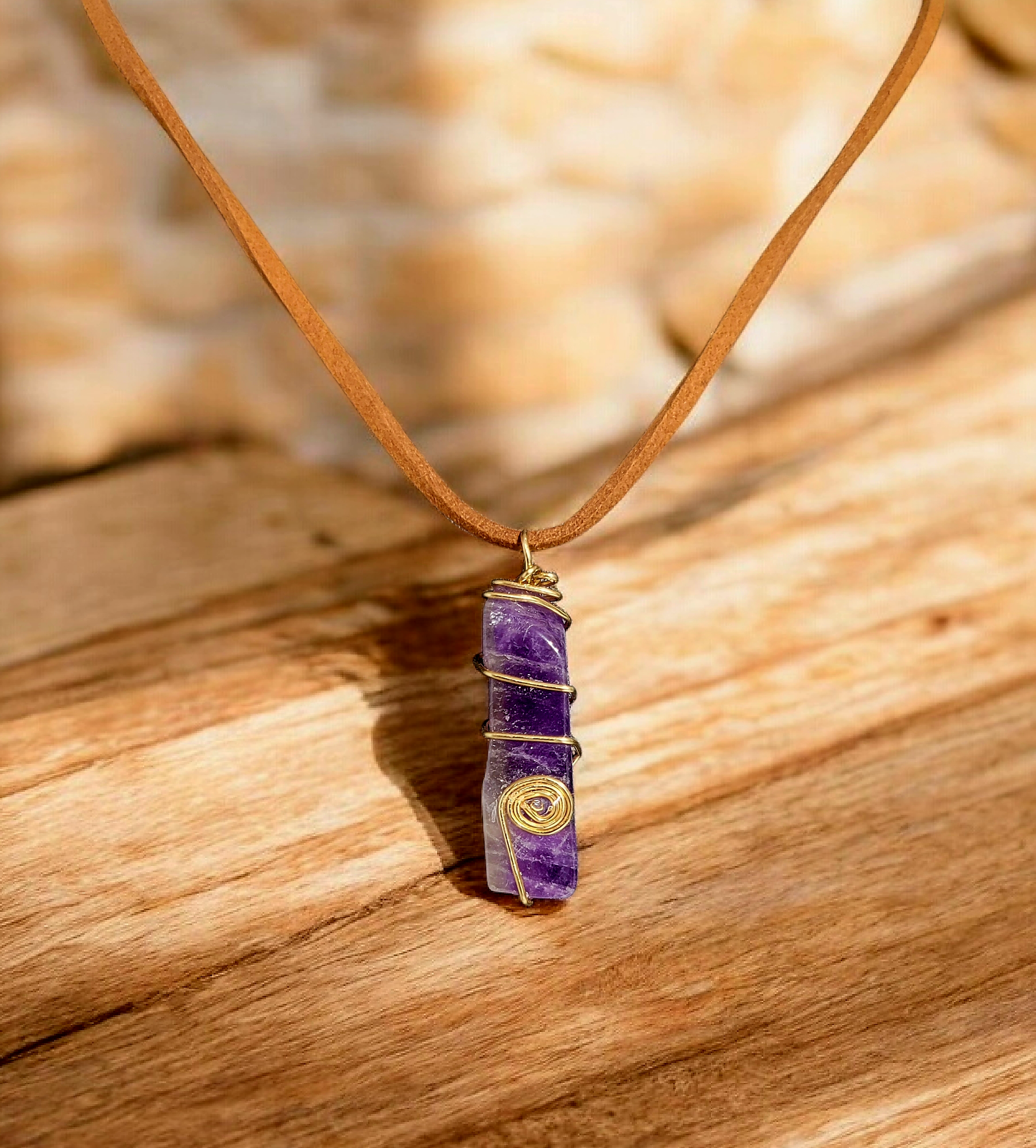 1/pc. Collier cordon suède ajustable. Véritable pierre d'améthyste enroulé de cuivre teinté or.