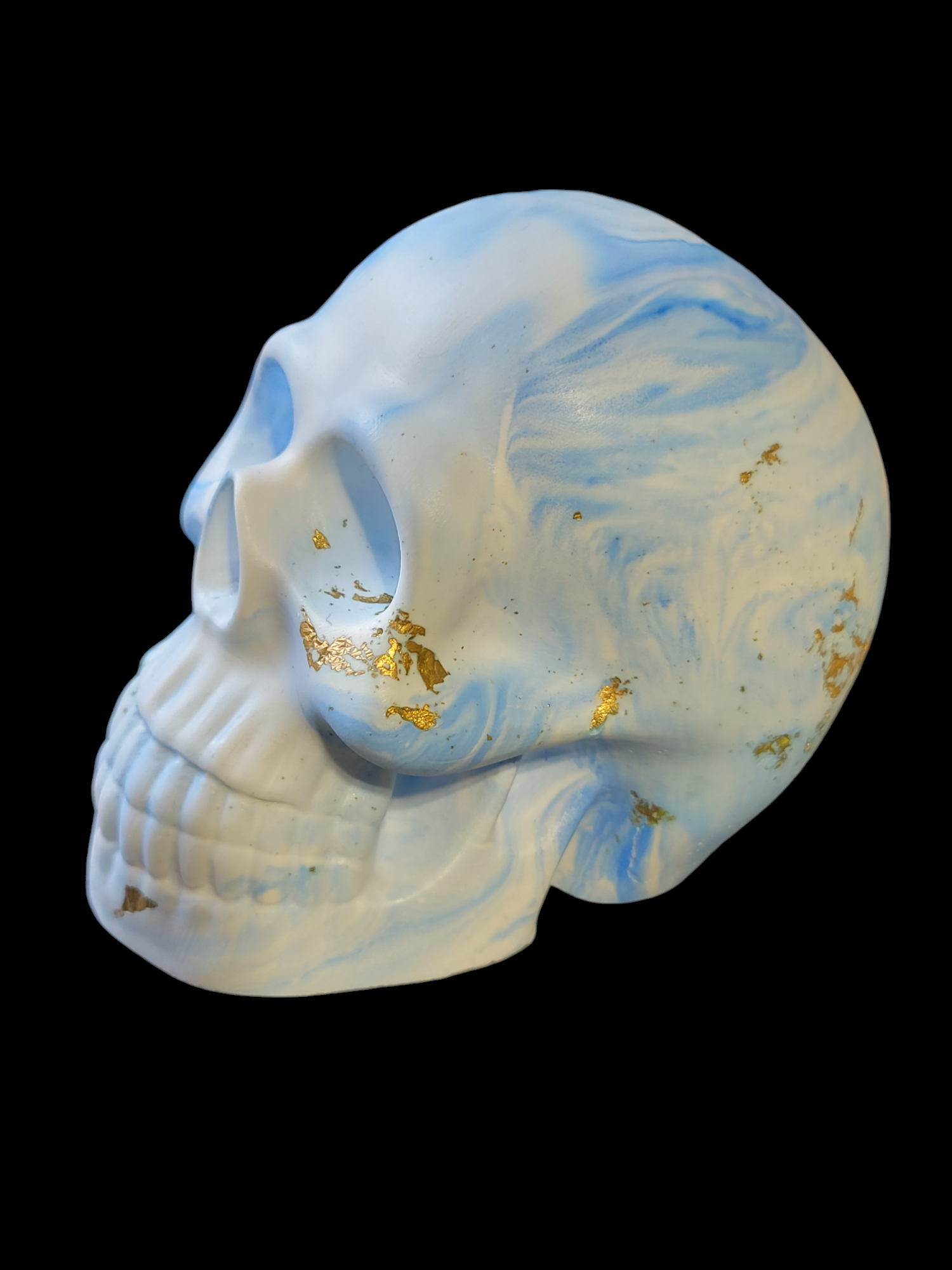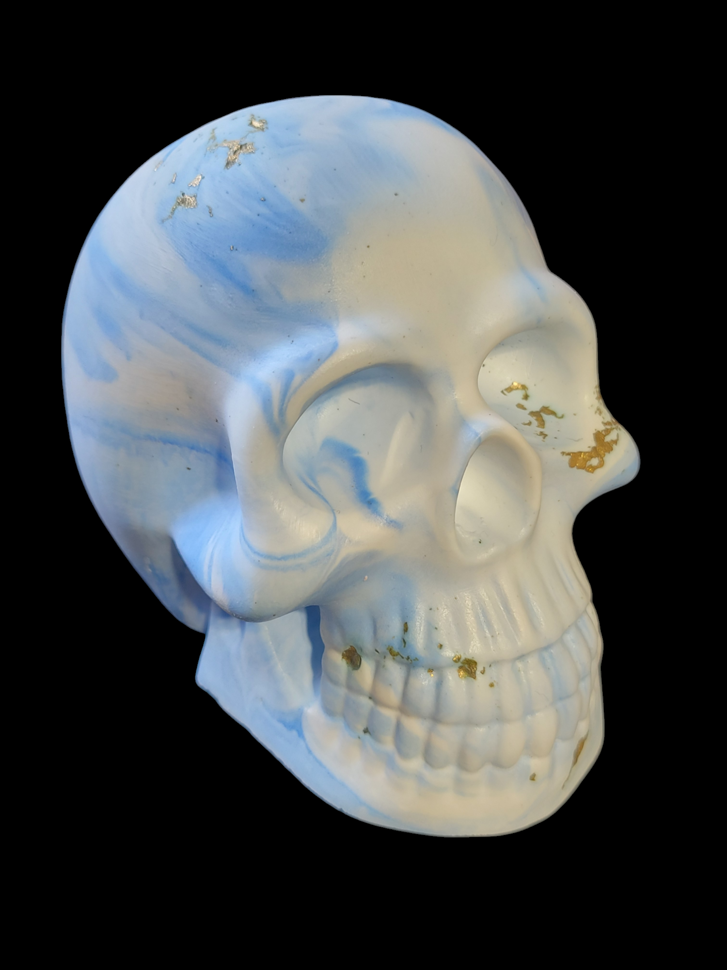 1/pc. Crâne fait en poudre de plâtre. Bleu et blanc et feuille d'or. 9 cm x 10 cm.