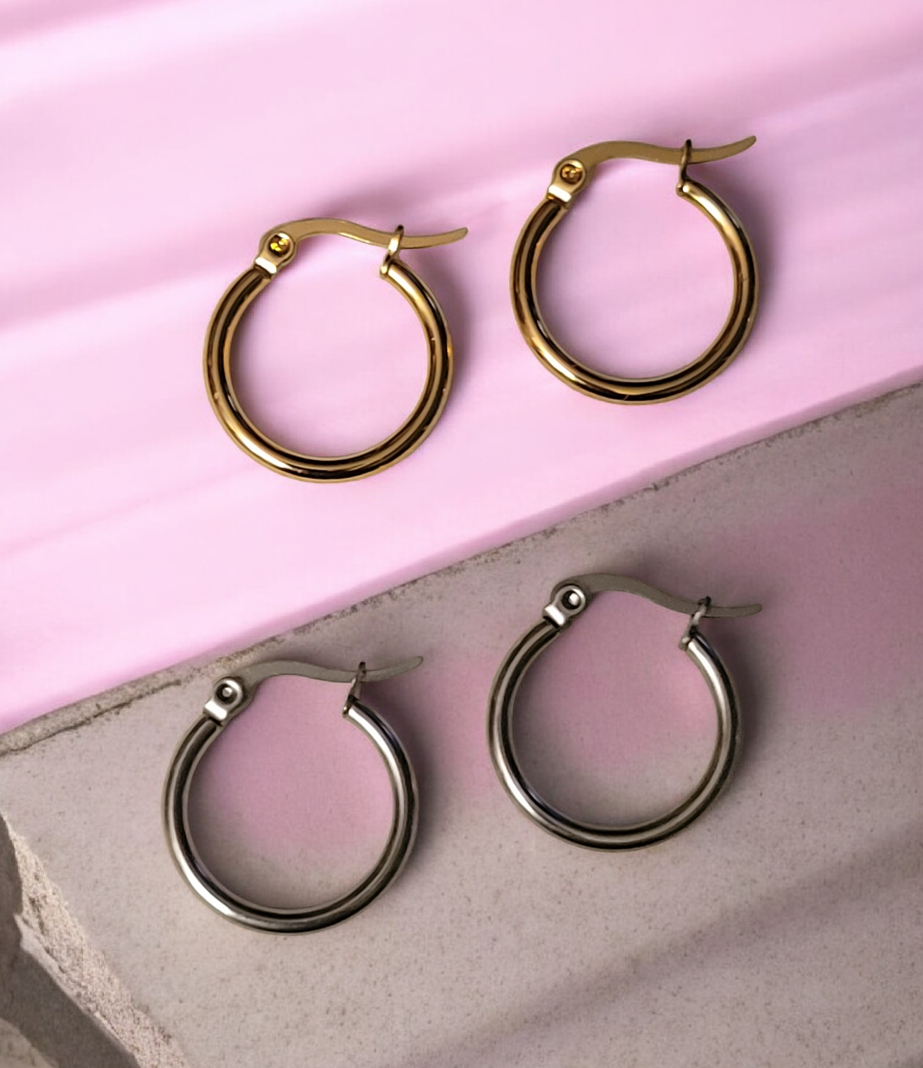 1/paire. Acier inoxydable. Ne ternissent pas. Argentée ou dorée. 2cm ou 2,5 cm.