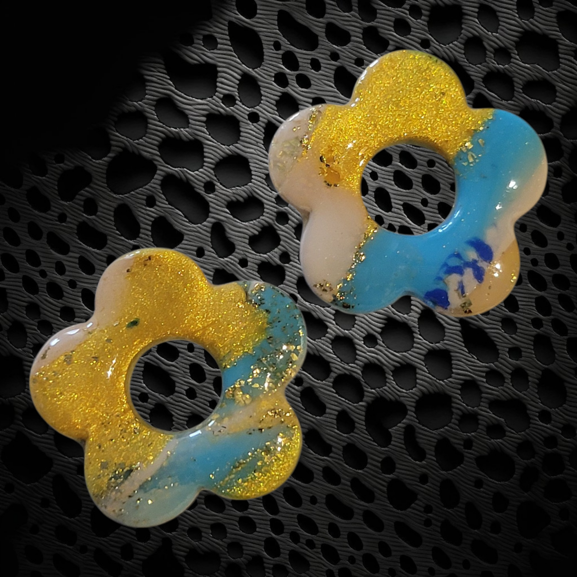 1/paire. Le style marbré évoque une esthétique élégante et contemporaine, caractérisée par des motifs tourbillonnants rappelant les veines de la pierre. Couleur dorée, vert et bleu, couleur chaude nous rappellent l'été. 2.5 cm x 2.5 cm. Pâte polymère et résine.