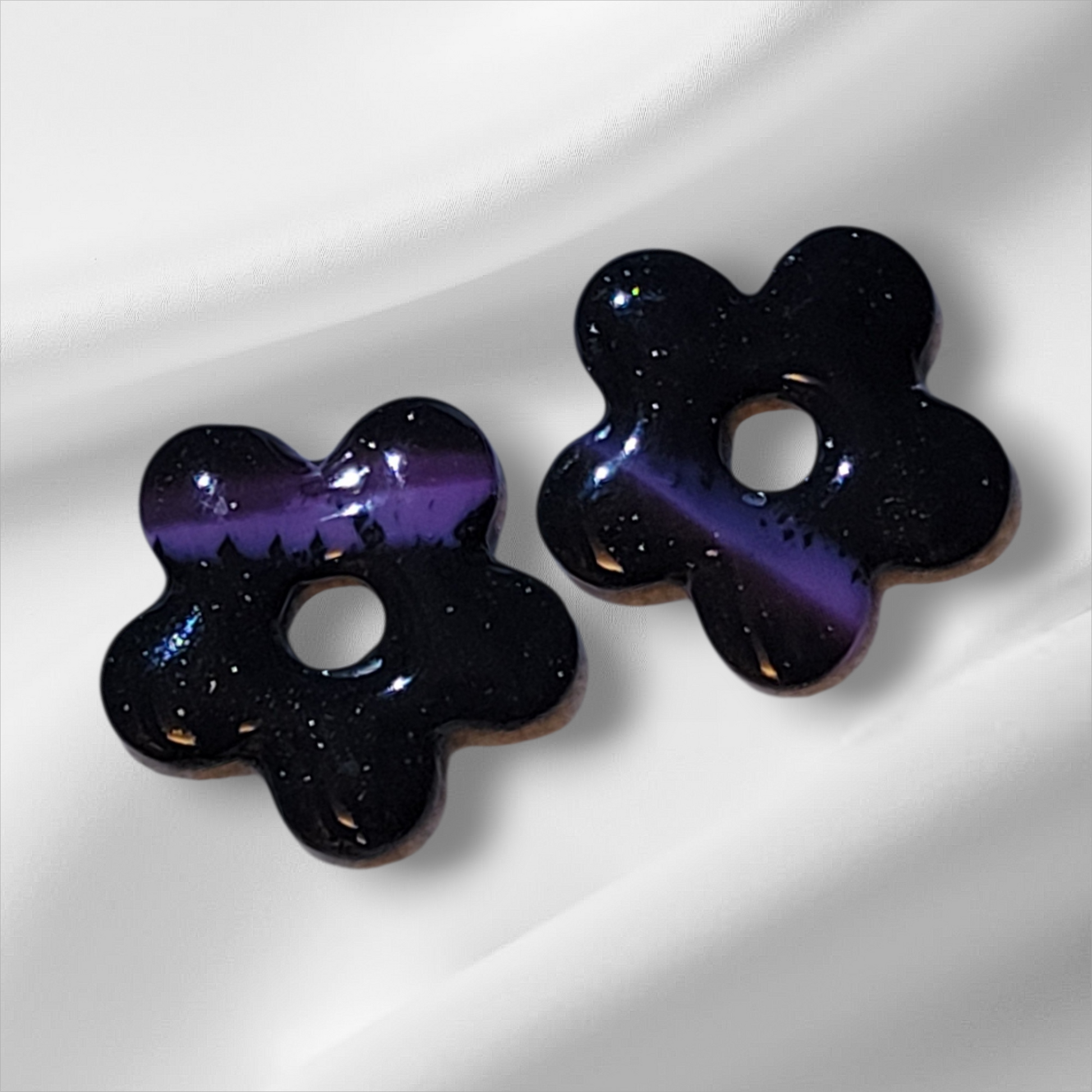1/paire. La thématique de la galaxie Noir et violet. 3 cm x 3 cm. ( Prendre créole de 2,5 cm pour un beau rendu). Pâte polymère et résine.