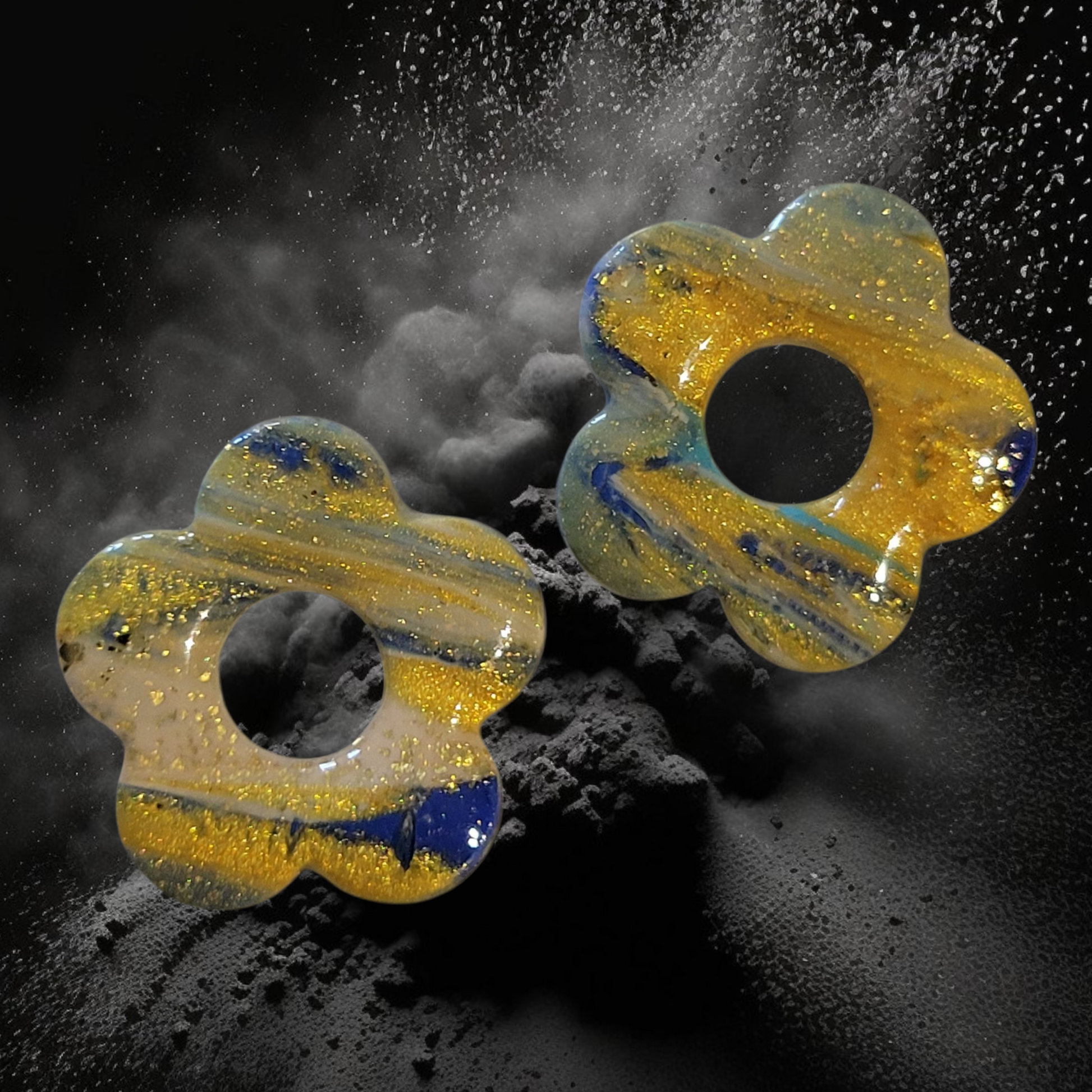 1/paire. Le style marbré évoque une esthétique élégante et contemporaine, caractérisée par des motifs tourbillonnants rappelant les veines de la pierre. Couleur dorée, vert et bleu, couleur chaude nous rappellent l'été. 2.5 cm x 2.5 cm.