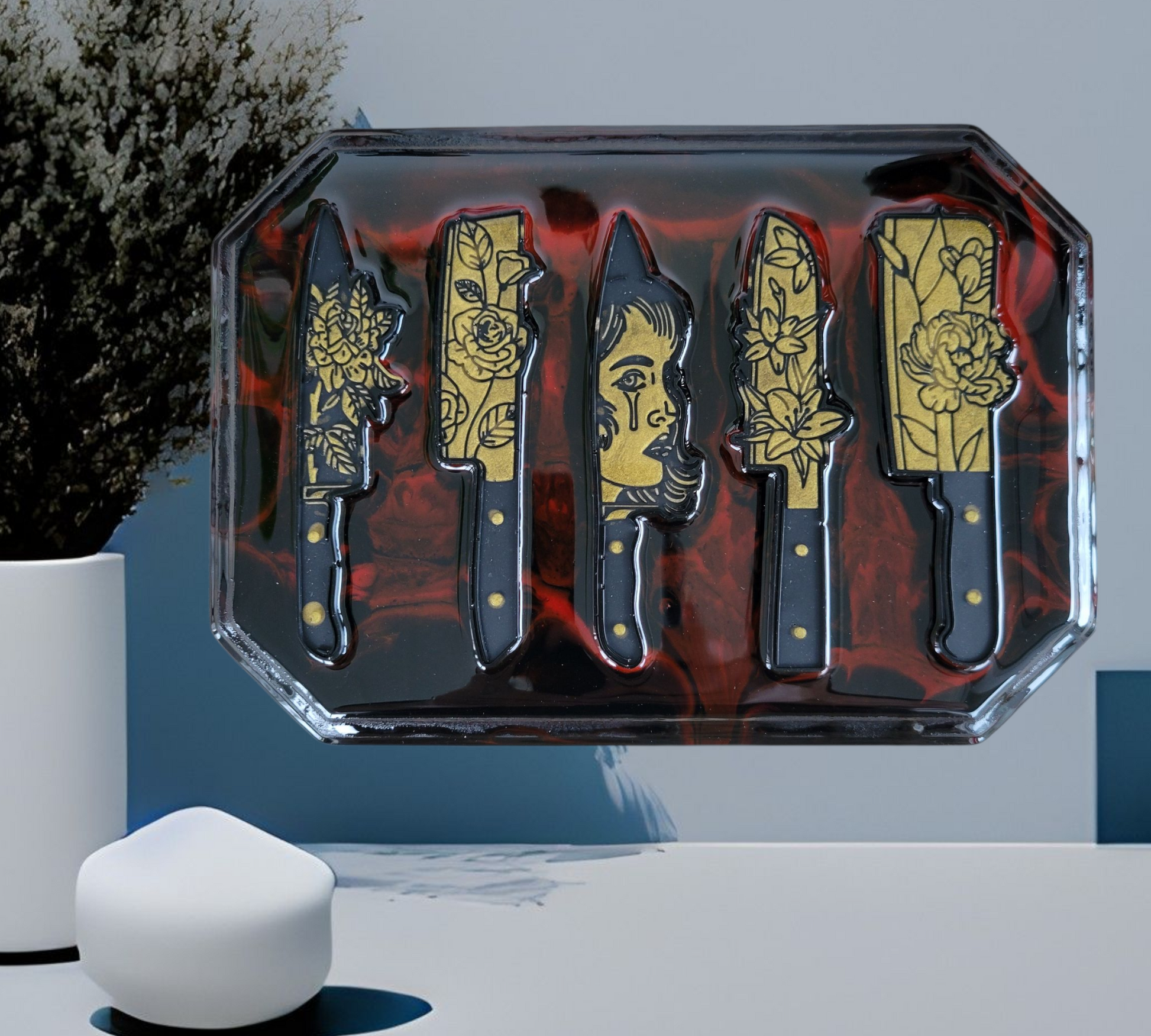 1/pc. Toile sur bois noie et rouge, couteaux noir et doré. 9,5 pouces x 6,5 pouces.